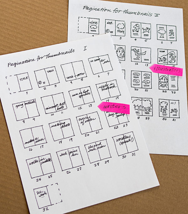 Once you’ve done this, you might want to do a quick thumbnail layout to help visualize the pagination. Back-of-the-napkin squiggles work fine. Include a word or two to show what happens on each spread. Or, if you are illustrating, do quick thumbnail sketches.