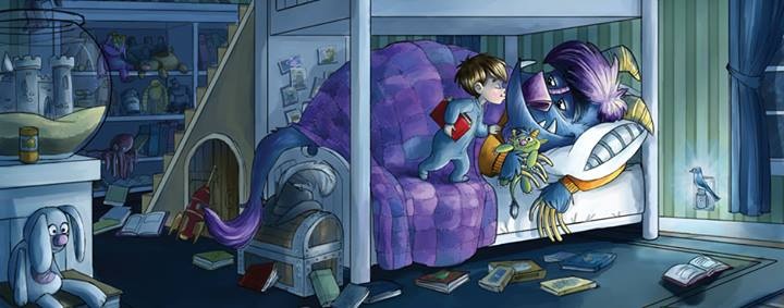 Now I am not going to try and pass off my book as one of the greats but since I have access to the images it’s easy for me to give an example. First I am going to give you the text to a spread from Monster Needs His Sleep, to be released April 15, then the picture. Try not to look at the picture first.