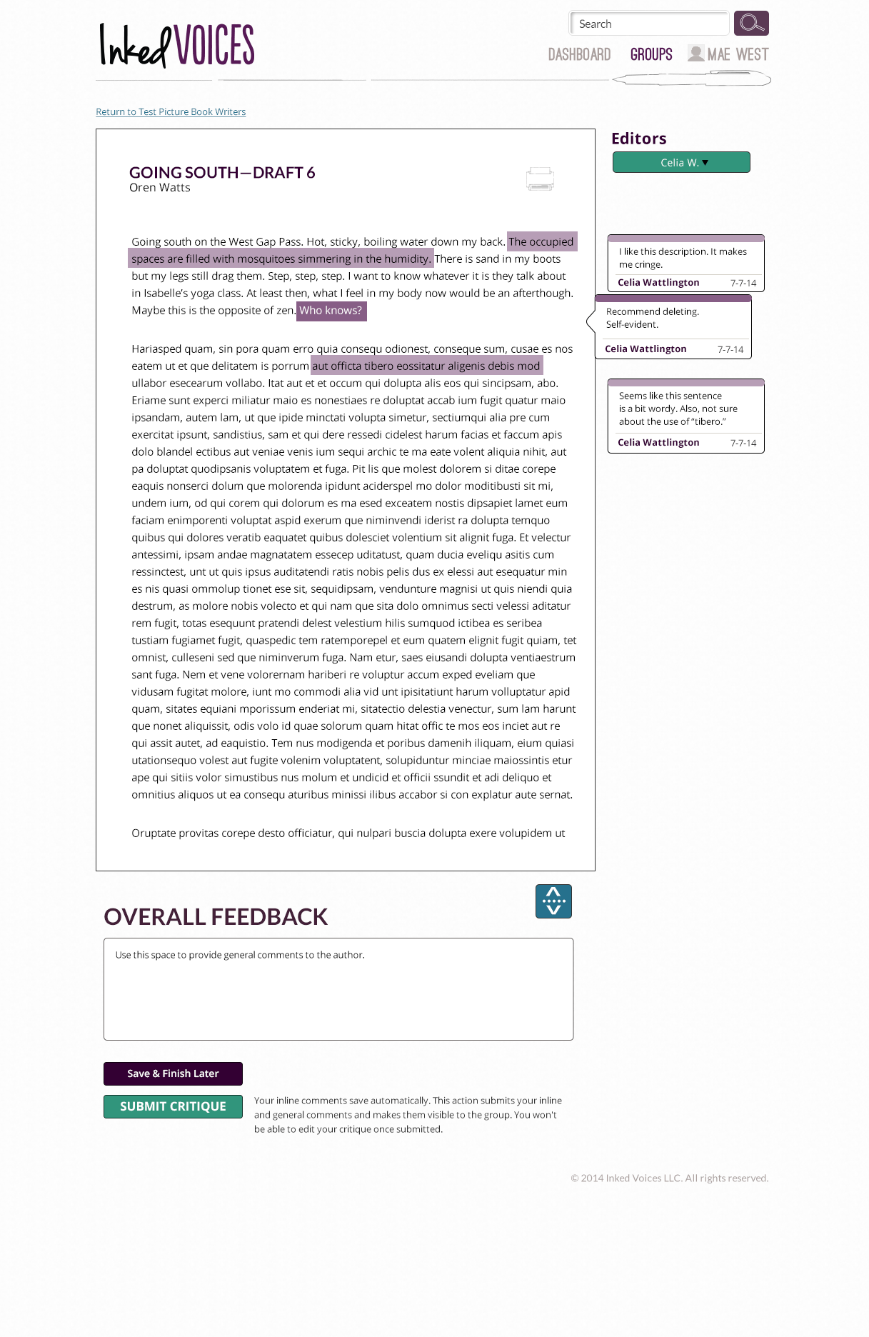 With writers’ feedback, we focused hard on the core of the application—the groups’ private pages and the critique interface. These are the places where people spend most of their time. For example, comments appear inline, are highlighted by reviewer and filterable by the same. And inline comments are printable. That was a big one. I said, “but you can’t do that in Google Docs.” But people pushed for it and I had to agree that, as a writer, it was kind of a big deal. So it happened.