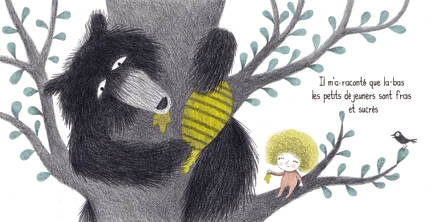 Images inside the book revealed differences between the French and English versions, most notably removing the bird character in the English version until the end of the story. This is an interesting choice since the bird isn’t literally in the story until the end when the girl goes home to free it; however the French version takes license and introduces the idea of the bird in the earlier imaginative spreads when the bear is telling his story.