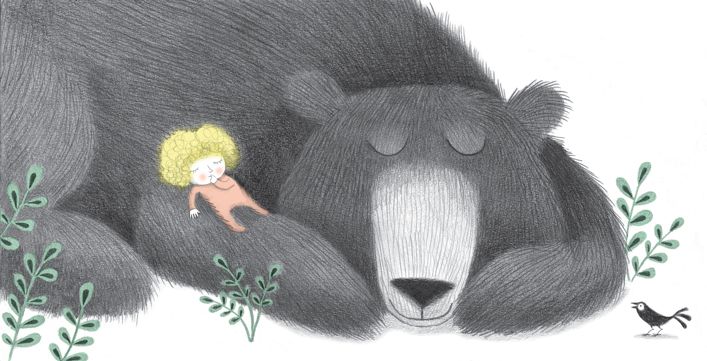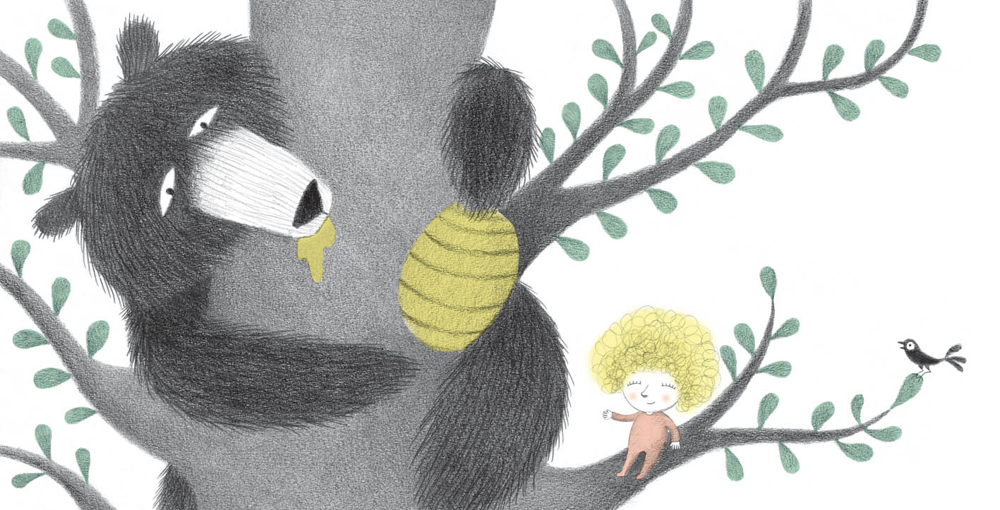 Here, Johnson made changes similar to the honeycomb image: the bear’s head and ears have been curved into friendlier, distinct shapes. His eyes have been moved slightly apart, muzzle elongated, all of which help him become more individual and more lovable. Johnson has redrawn the bear’s arm to make his resting posture more relaxed and weight bearing – you can feel him resting on his forepaw. The angle and softness of the fur has changed, helping the composition and better defining the bear’s form. The addition of plants helps the design of the page, linking it to a setting and to the other images in the book. Reducing the shadow under the bear and bird helps to clean up and simplify the image.