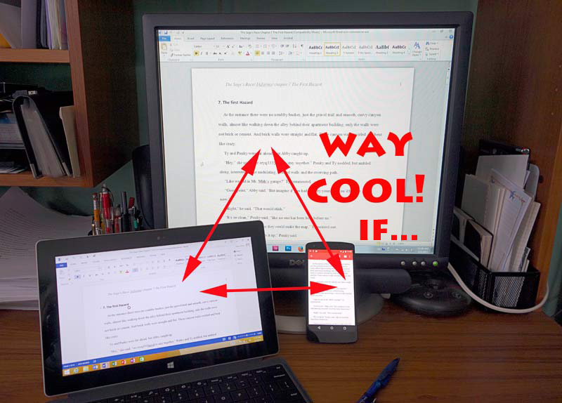 For example, even inexpensive little laptops can use One Drive to sync your text and images with your home computer. Vunderbar! But make sure to allow time for syncing and saving when shutting off the device and between it and your permanent set-up. When my elderly mother was not well I bought a nifty Microsoft Surface to use while mom-sitting if she was napping. I did not choose the Pro version because then I would have had to buy the software I needed. The basic version came with enough of the programs I use most. This mini laptop can detach from the keyboard (attaches magnetically) to use as a tablet. It’s portable, yet it has a big enough screen for work on long documents. However using Dropbox for syncing on it, which it supposedly can do, became a hassle. That’s because Microsoft has its own sharing system called OneDrive (formerly SkyDrive). It saves files much more slowly on the Surface than on my desktop. Ugh. Discipline builds character, right? The bottom line is that I could edit a manuscript while visiting my mother in rehab and it would automatically sync with my desktop as long as I always gave it enough time to really save the edits.