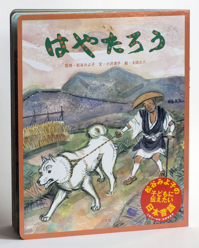 W Japanese storyAs you can see by the cover, this board book is read from right to left. The interior text flows top to bottom and calligraphy is a lyrical design element of its twenty-four pages. The beautiful watercolor illustrations of this Japanese folktale retold by Matsutani Miyoko, are reminiscent of traditional paintings with textured washes and linear elements done with a brush. It seems more sophisticated than we might expect for a board book presumably for young children. The content of the story is equally mature. I do not have a translation, however here is an attempt at describing what the pictures show. The story appears to be about a man who encounters a village with some serious problem. He tells the villagers to go to a shrine to pray near what seems to be a wooden casket. Two big monkey-like beings (or demons?) break the casket open and steal the woman’s body from inside. The man continues on his way, greeting others. Another man chases a white wolf from near a house where people live. Again villagers appear to bring a coffin to a shrine. Again the monkey demons come, but this time the white wolf attacks them, killing both, but also sacrificing his own life. The villagers are sorrowful that they had not treated the white wolf well. They now see that he was a good being. It is a powerful story.