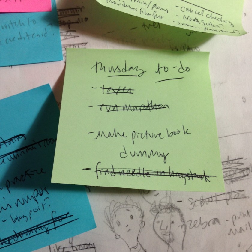 - Listing out a big mess of all the major steps (writing draft of text/determining arc of story, sketching composition dummy, collecting reference images, character design iterations, thumbnail sketches of environments/backgrounds, mocking up color palettes, experimenting with texture…), then crossing them out, recombining and rewriting them until it makes some kind of sense.