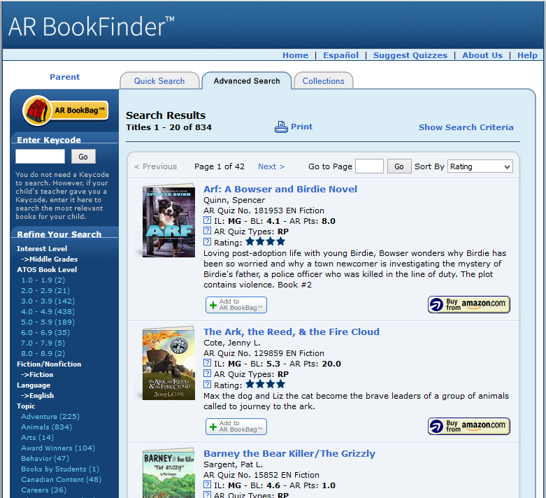 YIKES! 834 middle-grade books about dogs? If you are writing nonfiction about a very specific topic and want to find other books on the same subject, Advanced Search may be useful. But if you are trying to figure out how your fiction book fits into the kidlit landscape, you may be better off browsing the children’s section of your local brick-and-mortar library or bookstore, and then coming back to the AR BookFinder for stats on specific titles.