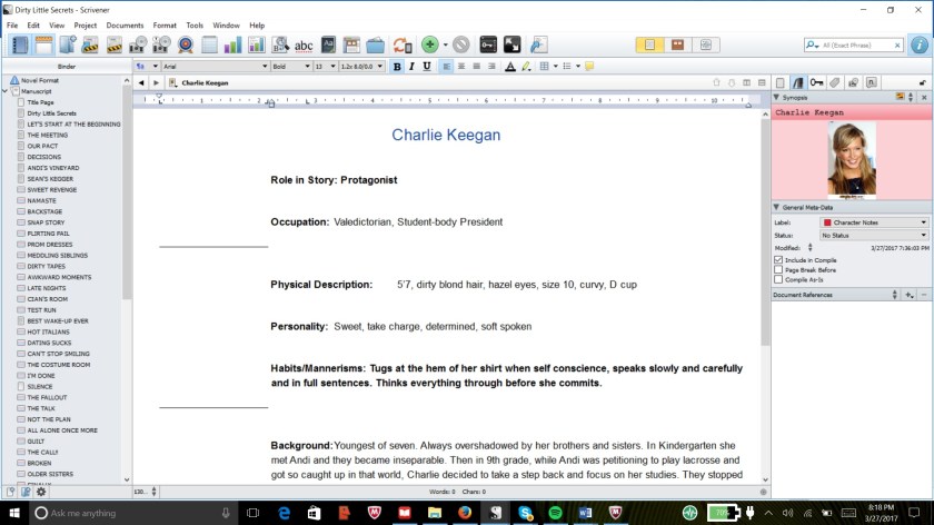 Character and Setting Outlines: There are tabs on the document that allow you to put notes in for your characters and settings. Scrivener provides a list of questions for you to answer to further explore your character or setting. You can also “tag in” pictures to match the characters or setting. Of course, this leads me to spend WAY too much time plotting and not enough time writing.