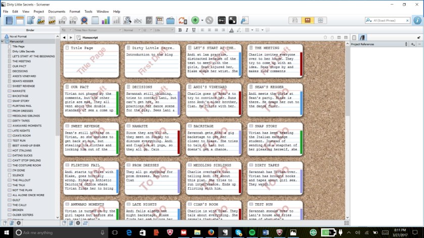 The Corkboard: You can view each of your scenes in the form of note cards. Then you can color code the note cards by keywords. For the work-in-progress I’m working on, I have 4 Points of View, so each color denotes the POV of that chapter.