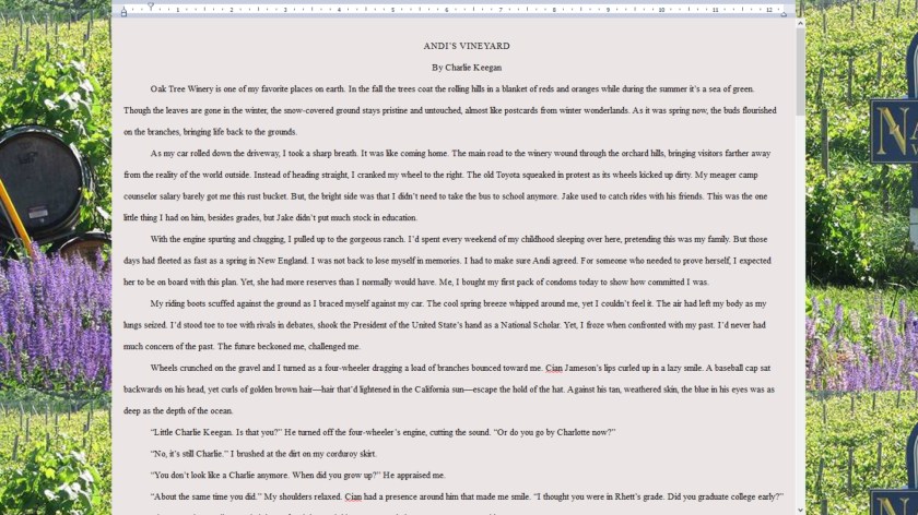 Full Screen with Background: This is my favorite function. If you haven’t noticed in all of the pictures I have pasted, the document is surrounded by a lot of extra sidebars and apps that can be distracting. Well, you can pull the document up in full screen and if you add a background to it, you can make it look like you are wherever your story is taking place. It is perfect to help you get into the scene.