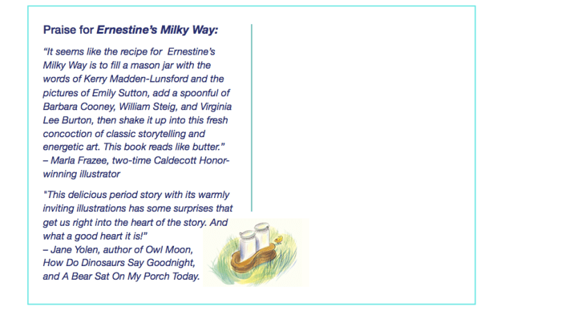 We did a tour of rural Alabama libraries, offering art and writing workshops for kids of all ages. The late storyteller, Kathryn Tucker Windham, was the subject of the book, and she was a friend of Nelle Harper Lee’s. Mockingbird Publishers donated most of the proceeds of the book to the Selma Dallas County Public Library in Kathryn’s name. My latest book is Ernestine’s Milky Way, which will be published by Schwartz & Wade (Random House) this March.