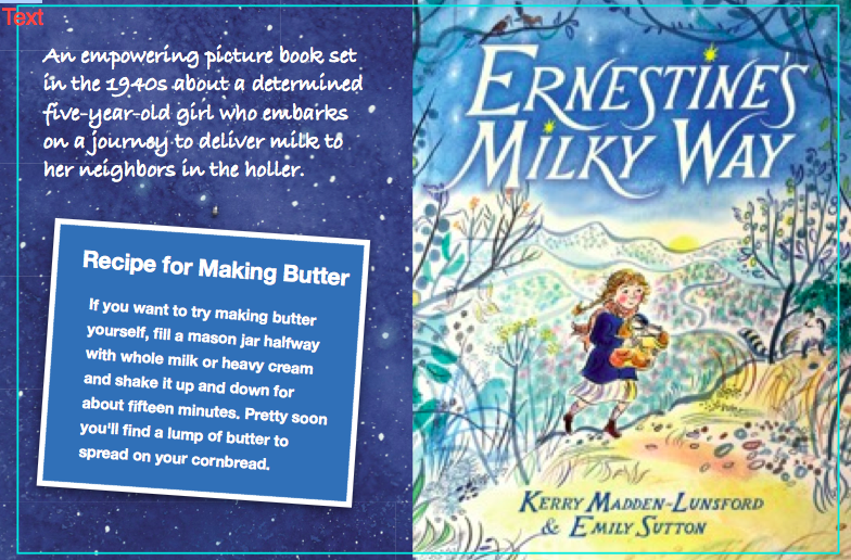 KML: I met the real Ernestine in 2005 when Gentle’s Holler was published, and we became great friends. I just adored her. She passed away last year, but she was my mountain mother. I wrote about her in this blog post. One of Ernestine’s first jobs was carrying a mason jar of milk through the mountains to the family in the other holler who needed milk. Ernestine did this chore for her mama after school, but in my story, she goes in the morning, so the Milky Way can light her way as she carries the milk on her own “milky way,” which was a big journey for a five-year-old girl even in 1941.
