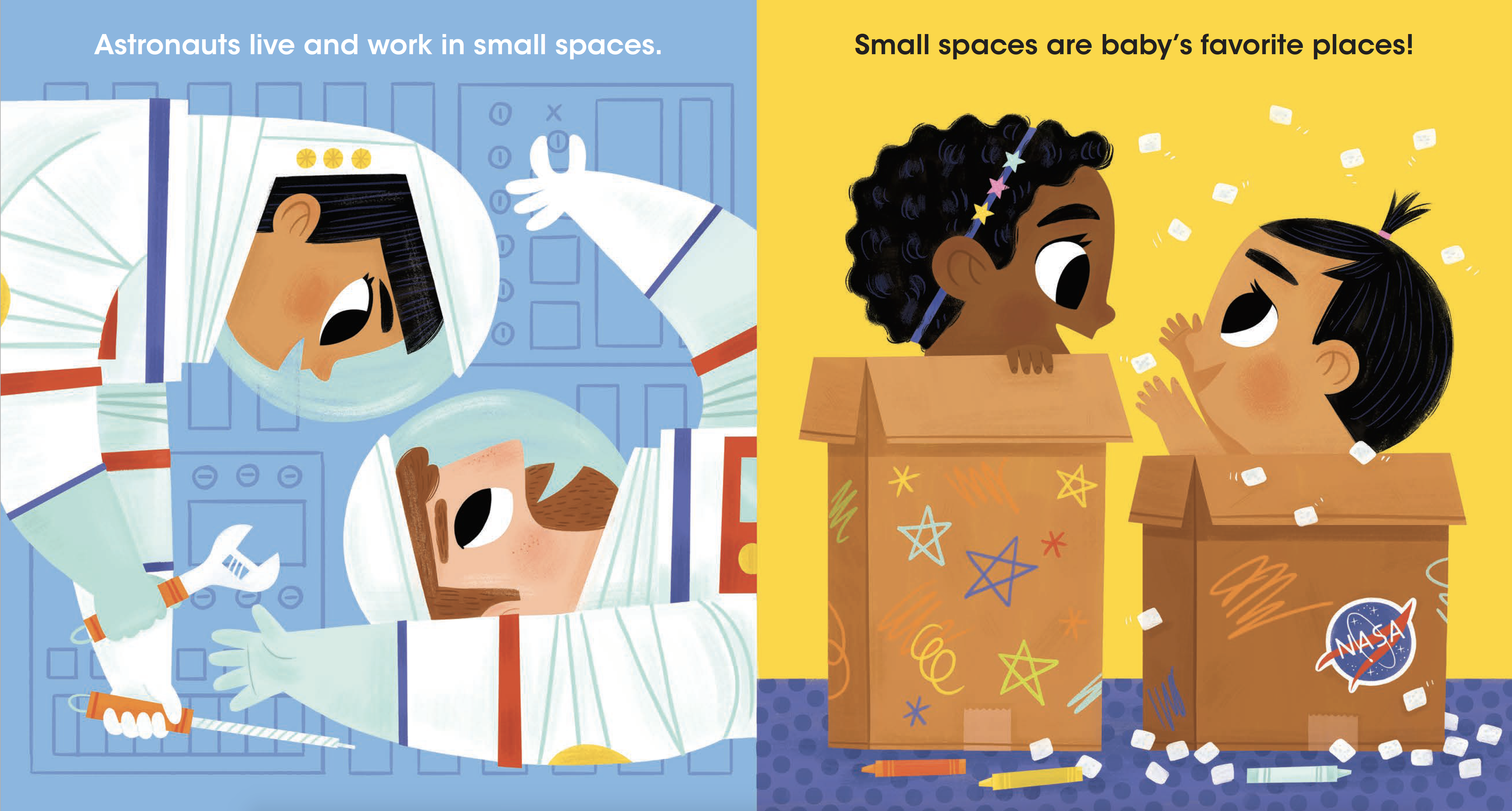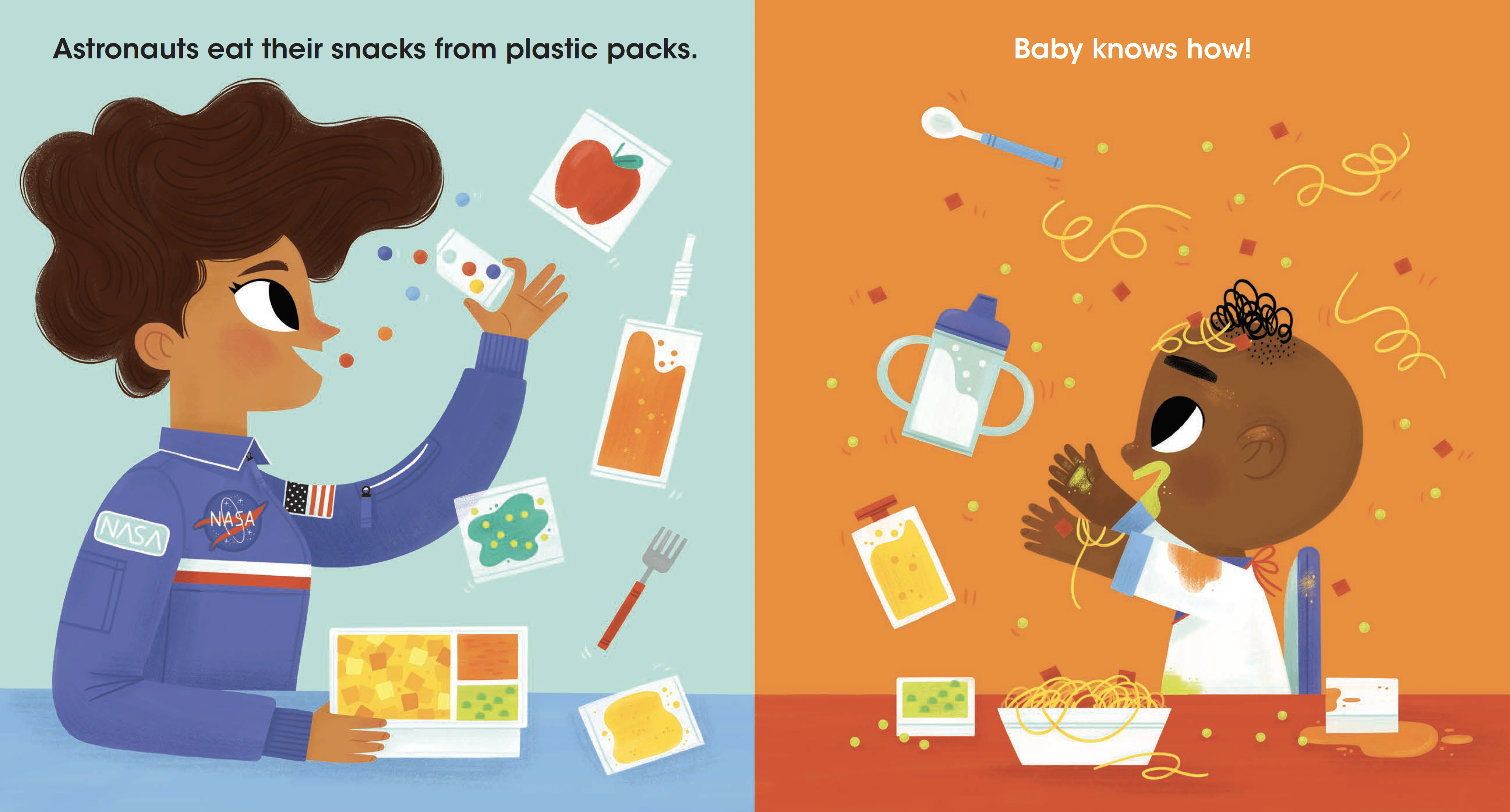 LA: Thank you! I knew there were already science-themed board books on the market that attempt to distill complex information into something a toddler might understand. I wanted to try something different. Rather than teach difficult concepts, I attempted to show how baby’s current skills match up with the job at hand (in a playful way, of course). Here are a few of my favorite comparisons from Future Astronaut: