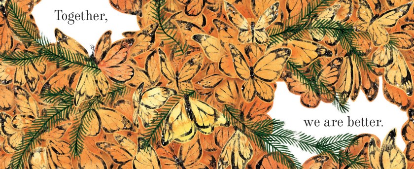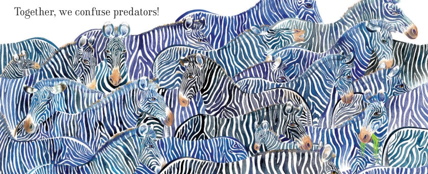 As far as the end pages go, I wanted to place subtle hints in the book about our place in the ecosystem. So often we forget that humans are indeed animals, and the erasure of this fact allows for the othering of species that we share our planet with. This book isn’t merely about how isolated groups in nature use teamwork, it’s about the importance of togetherness. Whole ecosystems rely on every member to function well. Biodiversity is key; science has shown us time and again that “all together, we are better”. There’s a nod to this concept under the book jacket as well.