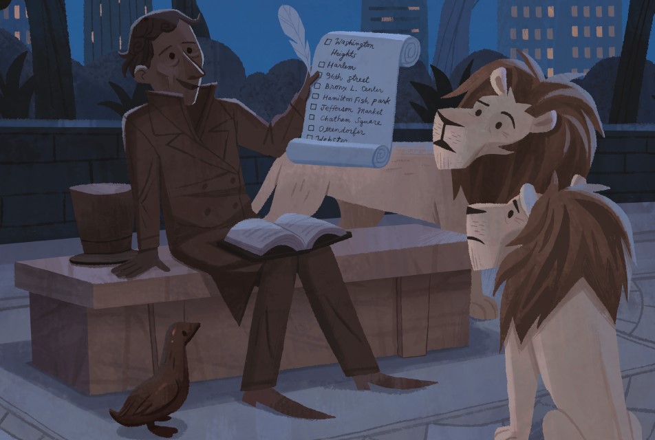 In WHERE IS OUR LIBRARY?, Patience and Fortitude venture all over Manhattan one night looking for their missing library books.
