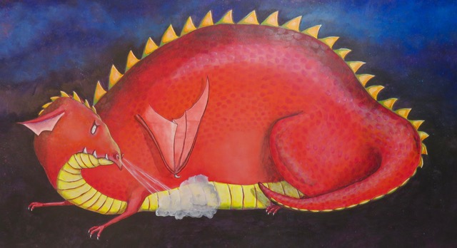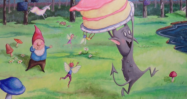 Another facial element the illustrator uses to enliven her character’s personalities is their teeth. The denizens of This is the Glade Where Jack Lives: or How a Unicorn Saves the Day, which is coming in January from Harry N. Abrams, Inc., each have expressive denticles. Jack the unicorn has “normal” square teeth because of course that’s what unicorns have. The red dragon boasts appropriately pointy teeth since dragons are terribly ferocious in spite of their disarming appearance. The warty backed, pointy tailed imp has a lone sharp bit of denture. Green goblins are drawn with pointy ears and teeny teeth sparsely distributed along the perimeters of their big dark oval mouths, like perfect ankle biters would have. And the gentleman they are attacking possesses but one square tooth. What does that say about him?