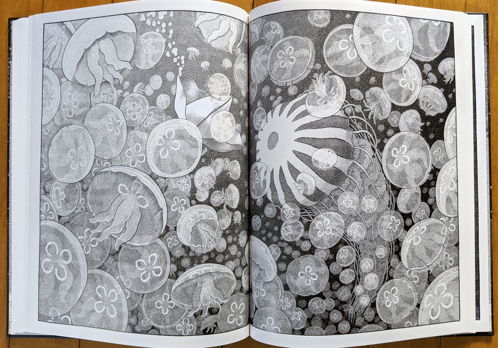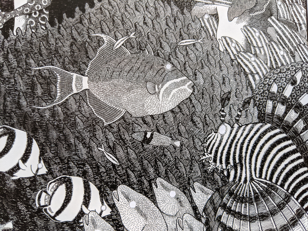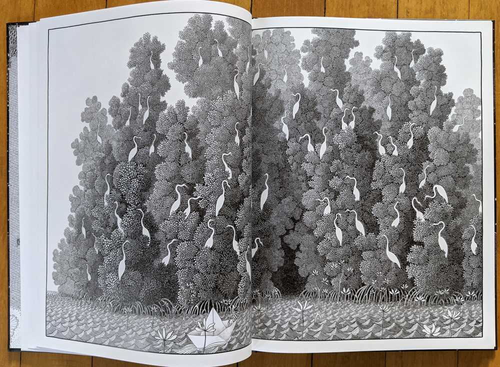 Look closely and see the innumerable tiny lines the artist used to create his fabulous world. How can one resist the mesmerizing pull of millions of hatched lines creating a universe of intense variety and intricacy?