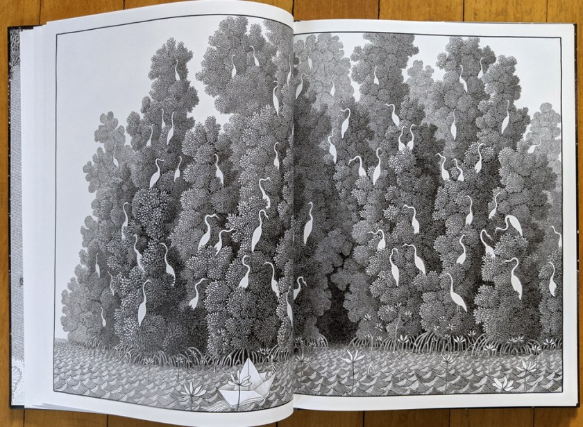 He does not use cross hatching, where layers of lines would cross over one another, nor stippling which involves only tiny dots to create different values. Throughout the 96 pages of this book Van Den Ende employs only hatched lines of various lengths and density to create his amazingly textured panoramas.