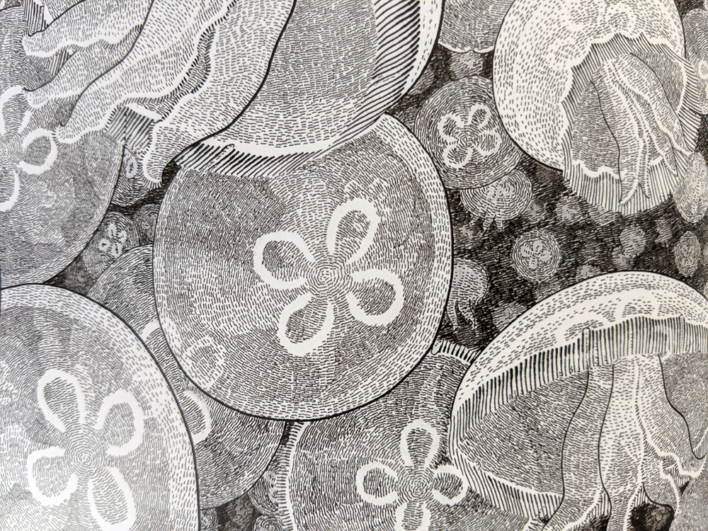 In Peter Van Den Ende’s ink drawings myriads of elements, be they sentient or otherwise, are rendered in endless varieties of textures in black and white hatching. The effect is overwhelmingly attractive to the viewer.