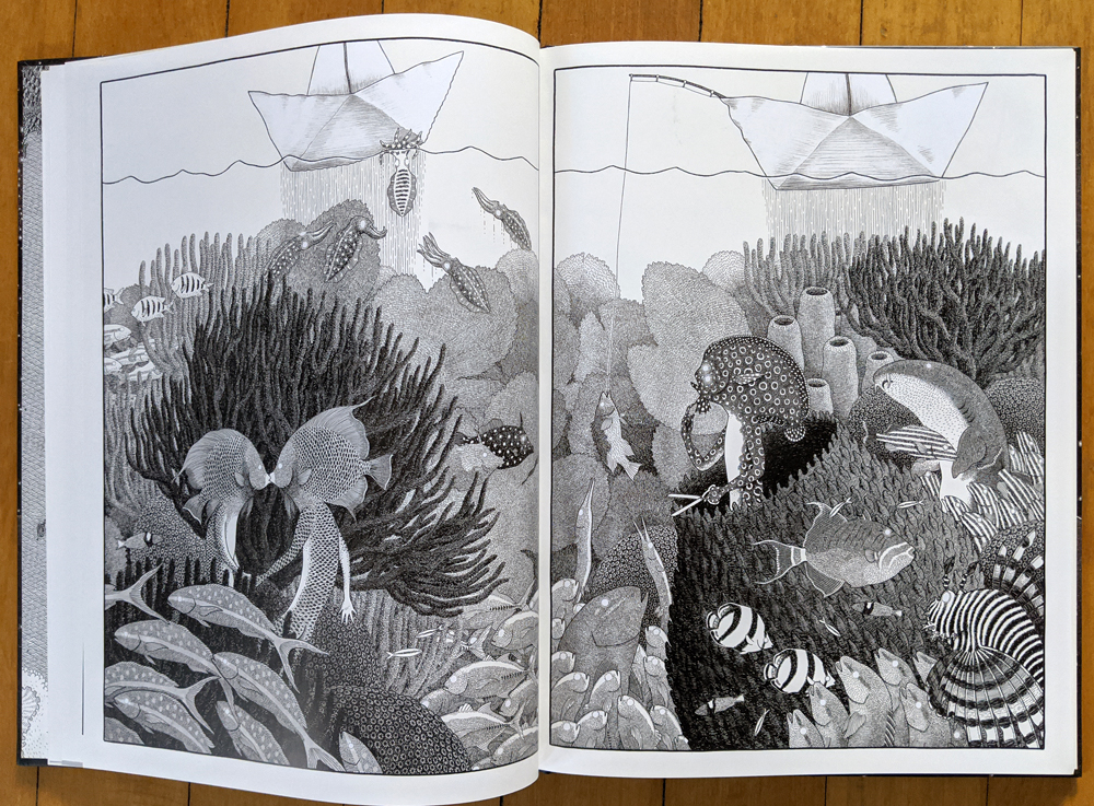The third is a remarkably illustrated nearly wordless book The Wanderer by Peter Van Den Ende about being brave in the face of vast calamity. Folded of paper by a boy and a character with a crescent shaped head and exotic uniform, a little paper boat roams the worldwide seas. This intrepid vessel encounters natural and man-made dangers, mysterious anthropomorphic creatures, in depths and heights that swarm with energy.