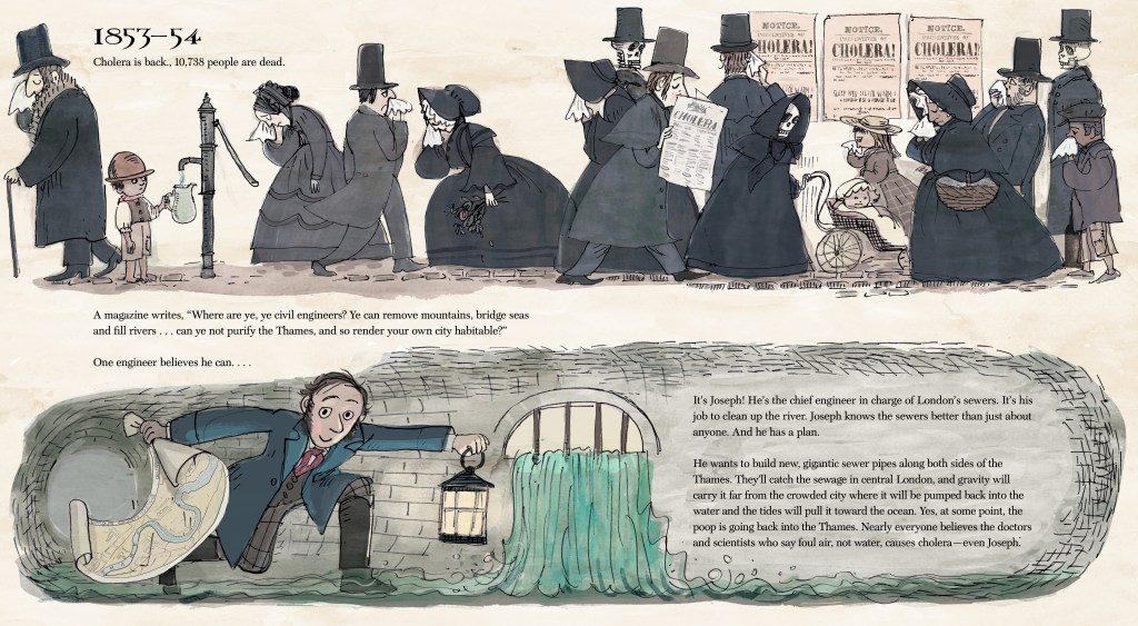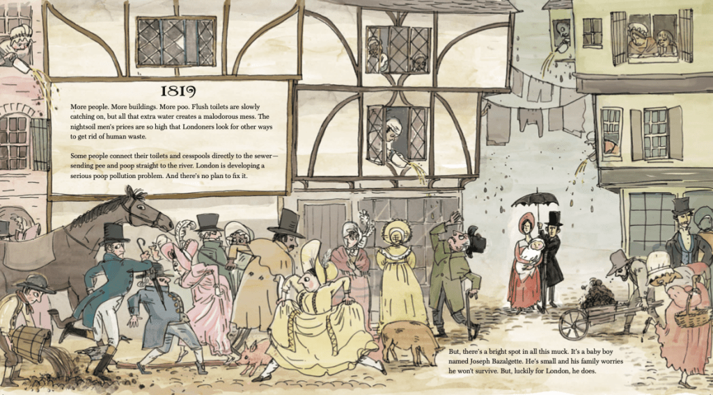 The spark of the story actually came from a few lines in Ruth Goodman’s book How to Be a Victorian. She mentioned the Great Stink, but didn’t say too much about it, so I did a little research. When I realized it combined poop, history, and engineering, and there was no book for children about it, I knew immediately that I wanted to be the person to write one.