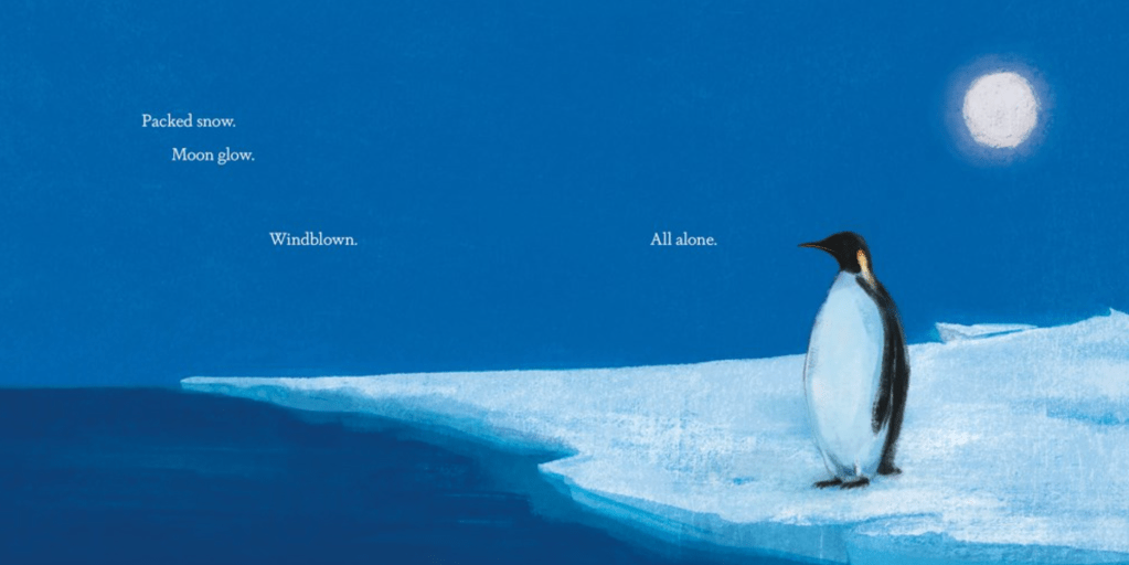 This spare language, and the book’s focus on all that Emperor penguins endure in order to raise a chick, necessitated a new title–hence PENGUIN JOURNEY.