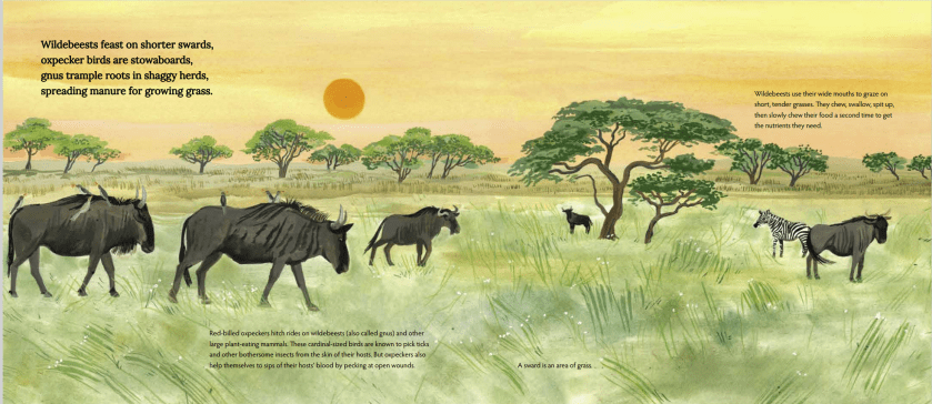 LB: Becca Stadtlander’s art IS gorgeous, isn’t it? She has captured the heart-filling panoramic splendor of Tanzania’s Serengeti Plain. Becca and I follow the typical process of working through our art director and editor; we do not communicate directly about any of the art/text. If I see something in a sketch that might need a tweak in the service of scientific accuracy, I let my editor know. Similarly, a sketch may show me that my words were unclear and then I do the tweaking. I’m not going to choose—every spread is my favorite!