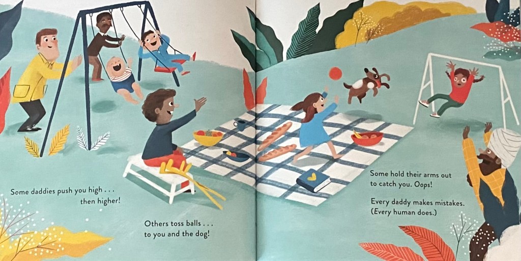 It touched on why I wrote the book–so kids would understand that they are not alone. We all realize at some point that our daddies are not perfect and are, in some ways, different from other daddies, but we love them for who they are. It was clear that my amazing editor, Naomi Krueger, had a vision for this manuscript. And one of the page spreads is my heart open on the page,