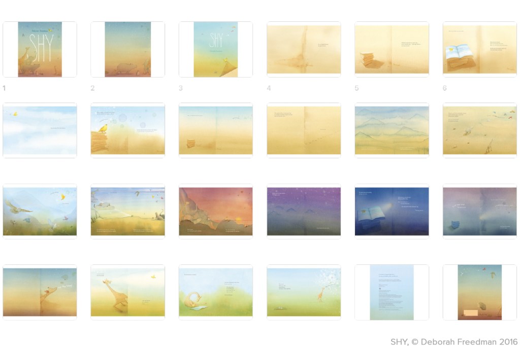 For instance, with my book Shy, I wondered if I could tell a story where the main character doesn’t appear visually until the end of the book. I mean, independent readers read books without pictures all the time, right? Could I even do a few really abstract spreads, with no characters at all? I was curious to see how much could I get away with in a picturebook. Along the way, I learned a lot about color, and how much work color alone could help me drive the emotional arc of the story.