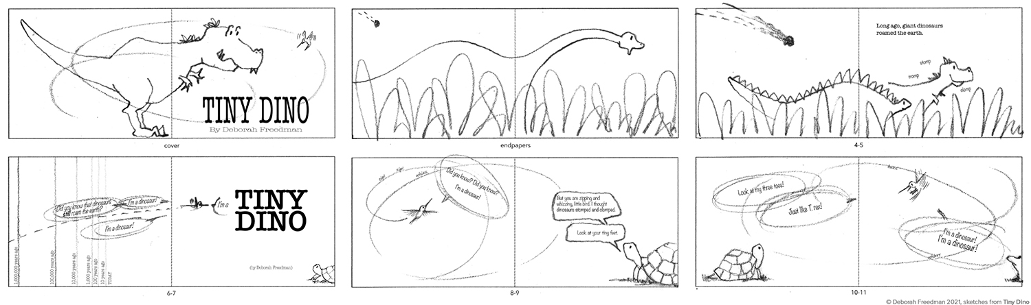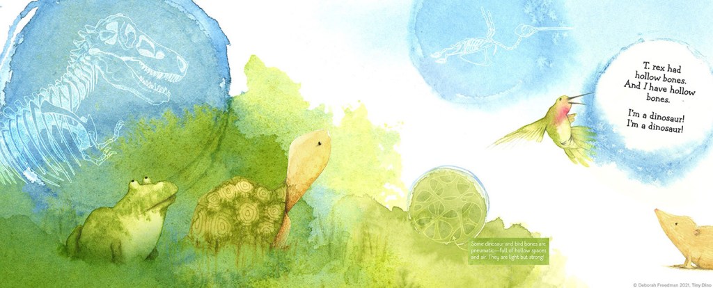 RB: Tiny Dino is such an adorable book. What a gift you have for writing, illustration, and presenting information in a kid-friendly way! I love informational picture books, and in Tiny Dino you have woven in both science and social emotional learning themes so beautifully. I recently read a review of Tiny Dino: “Freedman also folds in lessons on both science and the dangers of assumptions. An innovative introduction to the relatedness of all animals that will delight budding biologists and dino mavens alike.”-Kirkus, starred review. What a great tribute to your work! Do you have any advice for those of us working on children’s nonfiction and informational fiction?