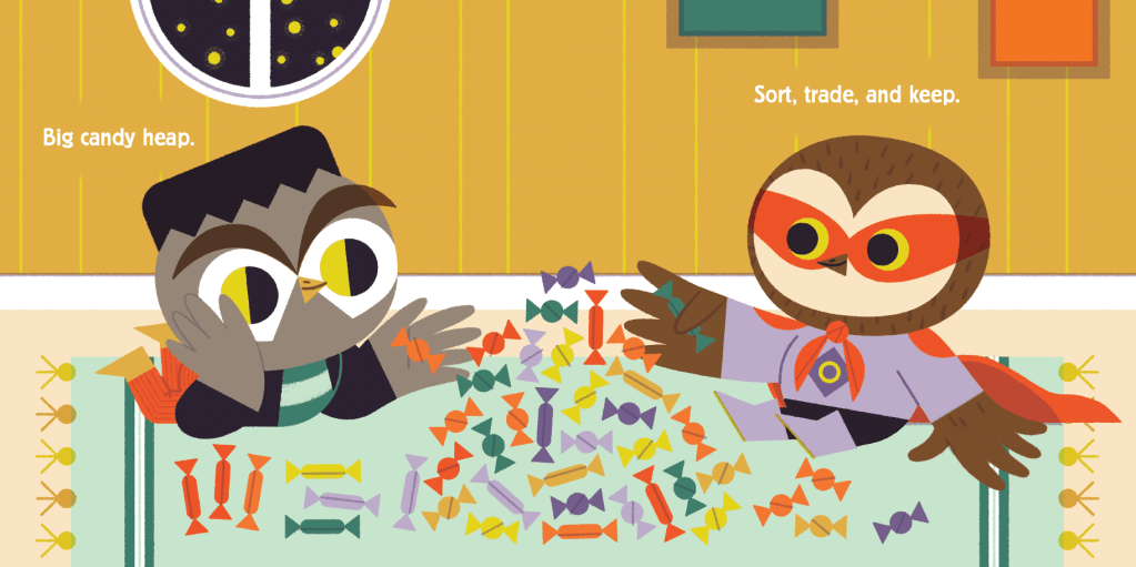 LG: When I write for this age group, I like to use very few words. This is especially true for books that might be read as bedtime stories, like Happy Owl-oween!, which ends with the owlets going to sleep after a busy night of trick-or-treating and candy-trading. I think my propensity for low word count is because of my experiences with my own four kids at a young age. As a parent, I always wanted bedtime stories that were short (yet satisfying!), so the kids and I could all get to bed. And with a quick story, I could give in to the “read it again, Mommy!” without pushing bedtime too late, so it was a win-win.