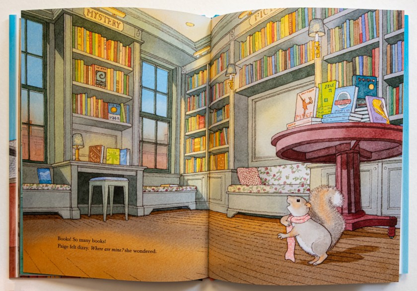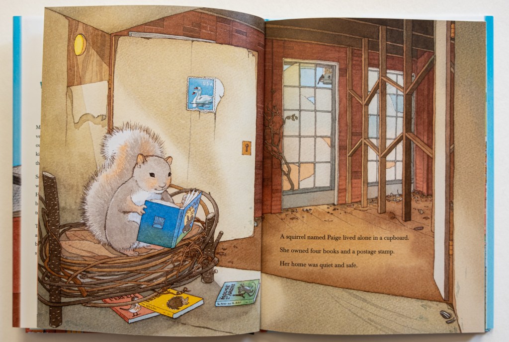 Charlie, another squirrel, befriends Paige, and soon other new friends appear. She misses her books, though. Surprised that Paige can read, Charlie asks her to tell him a story. Soon she shares tales with everyone. When Ferris reappears, Paige learns that her old building is now a bookstore. She investigates and finds a little door just her size. Inside she is surrounded by new books! Her cupboard is clean, and her precious books await.