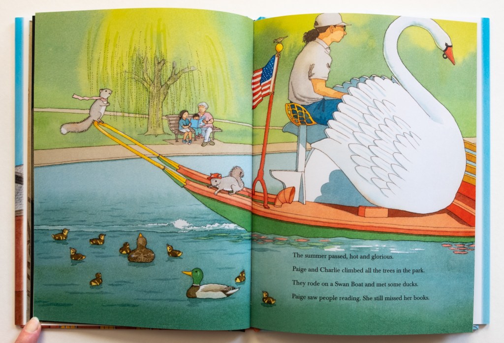SB: Yes, I put that in as a little salute to Melissa. She didn’t know I was going to. As for the rest, well, the ducks next to the Swan Boat are obviously the duck family from Make Way for Ducklings. And, look very very carefully at the books on the shelf above Paige on page 32.