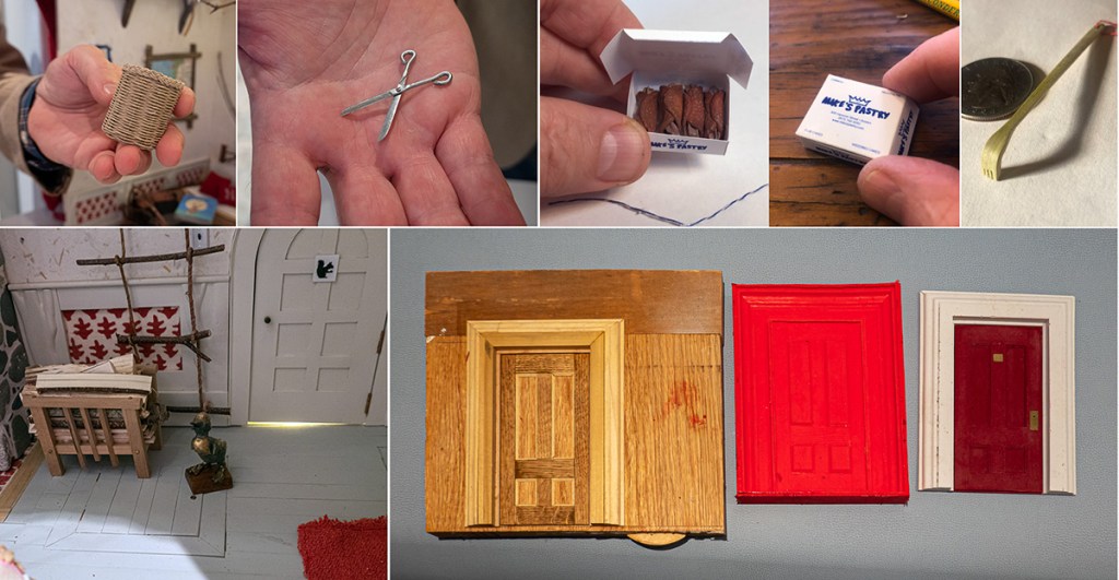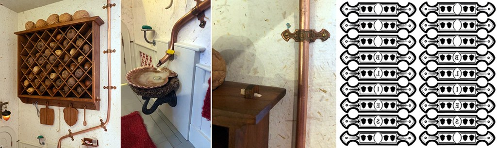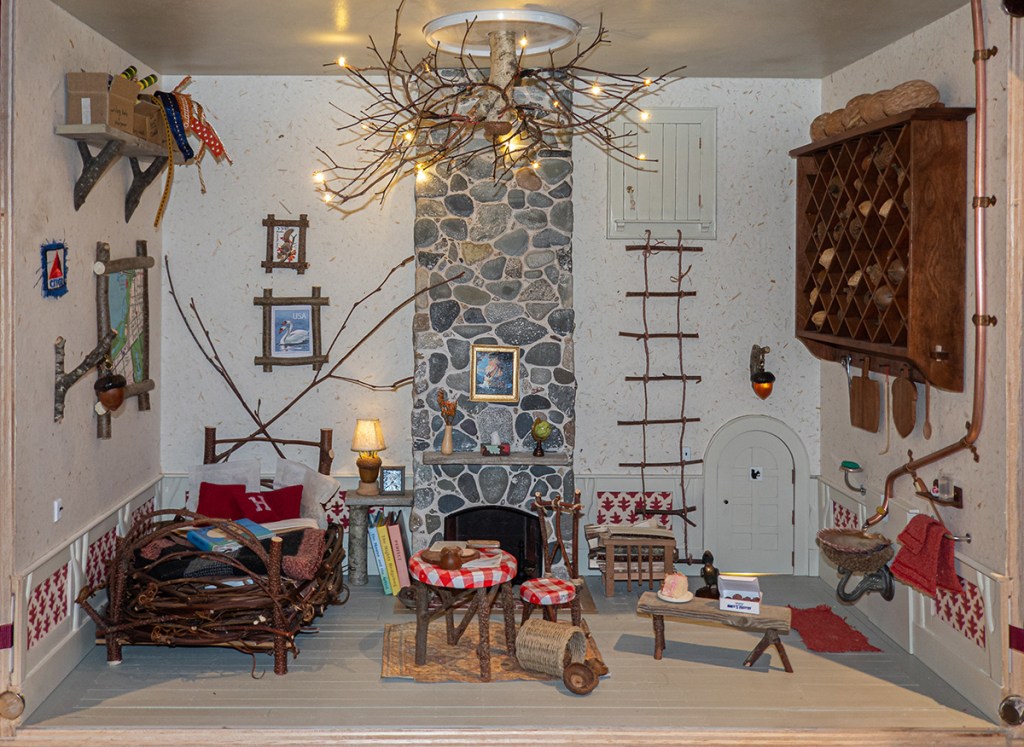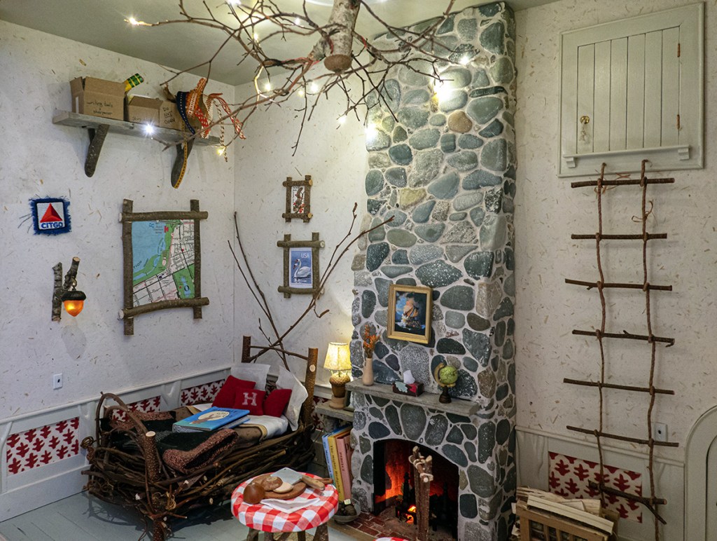 Brian fabricated the acorn table lamp and cast the wall sconces in translucent resin and inserted LEDs. From the ceiling hangs a chandelier made of Japanese maple twigs and teeny LED lights. The fire in the hearth has red LEDs that flicker realistically. For Paige’s front door, identical to the human-scaled one, he made a model of wood, made a mold of that, then cast it in resin. The street number plate and the back plate of the doorknob are brass onto which he acid etched the numbers and dotted pattern. He also etched the brackets that hold the copper water pipe to the wall above the sink. In this subtle way, he signed this artful environment. Yes, Paige’s toothbrush is there, a tumbler made from a Covid test kit tube, soap in a soap dish, and a tube of “Fang” toothpaste over the sink, which Brian made with a scallop shell resting in a big acorn cap.