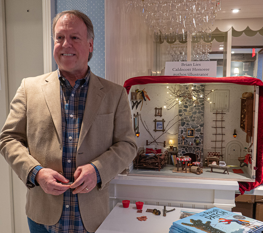 Melissa also needed to commission a craftsperson for the squirrel-sized home project. She told Sarah. Sarah’s good friend and critique group buddy, Brian Lies, is the author and illustrator of more than 30 books, among them the 2019 Randolph Caldecott Honor book The Rough Patch. When Sarah asked Brian if he knew anyone who would be a good candidate to create the squirrel alcove, he intrepidly raised his hand. He had done fine carpentry and was intrigued by the challenge. Brian would aim to create a well-appointed home that any literary squirrel would love.