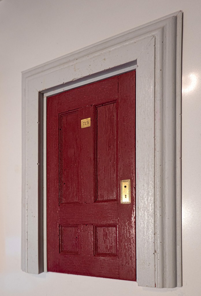 JAZ: Your attention to detail is remarkable. Even the squirrel-sized door you made for beside the human entry to the bookstore has a number and doorknob back plate of acid-etched brass. How did you do those tiny designs?