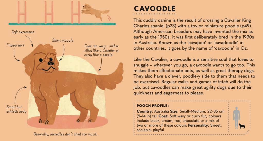 Some dogs, as many of you are undoubtably aware, are purposely crossbred into designer combinations. Under the heading CUTE CROSSBREEDS AND MARVELOUS MIXES, readers are introduced to Boradors – a mix between a Labrador and a Border Collie- and the adorable and playful Cavoodle (my next dog), a mix between a Cavalier King Charles Spaniel and a Miniature or Toy Poodle.