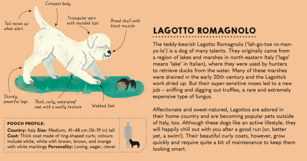 One final anecdote: A few weeks ago, I met the most unusual and adorable dog. Its tight, curly coat was Poodle-esque, but it had a big, blocky head that contrasted its coat. “What kind of dog is that?” I breathlessly quizzed the owner and asked him to repeat his answer three times. When every person behind me also quizzed the kind and patient owner, I suggested he call it a truffle dog instead. Kudos to Frances Evans for providing the phonetic pronunciation of each breed! And trust me when I tell you there are breeds within the ATLAS OF DOGS with names more difficult than this one!