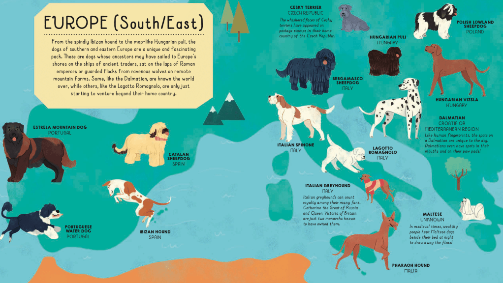 Interspersed throughout THE ATLAS OF DOGS are special interest pages. SUPER-DOGS introduces real life canine superheroes like Bear, a Collie-Koolie crossbreed who saved over 100 koalas trapped by terrible Australian brushfires in 2019 – 2020. Bear’s heroics merit being written up in a school report and prove my long-held belief that mutts are just as worthy of our love as purebred dogs are.