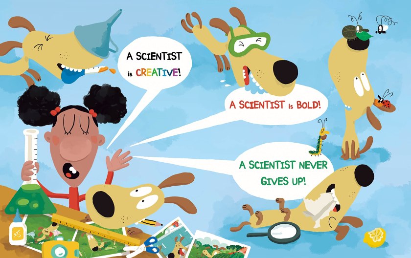 BE: Yes! My favorite spread is the one at the climax where Yara uses creative problem-solving and a heavy dose of emotional resilience to turn what she thought were ruined experiments into a winning idea. The spread has a lot of hilarious Renzo illustrations in it, which I love. It also has power statements “A scientist is creative!” “A scientist is bold!” “A scientist never gives up!” I love the energy Luisa captured in Yara’s moment of overcoming her obstacles.