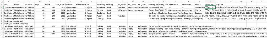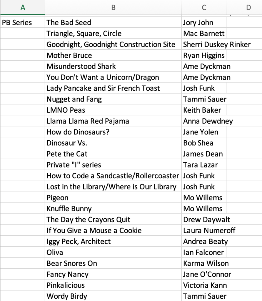 I started brainstorming, researching, and analyzing mentor texts. A perpetual list-maker and spreadsheet fanatic, I started a list of picture book series and sequels to study.