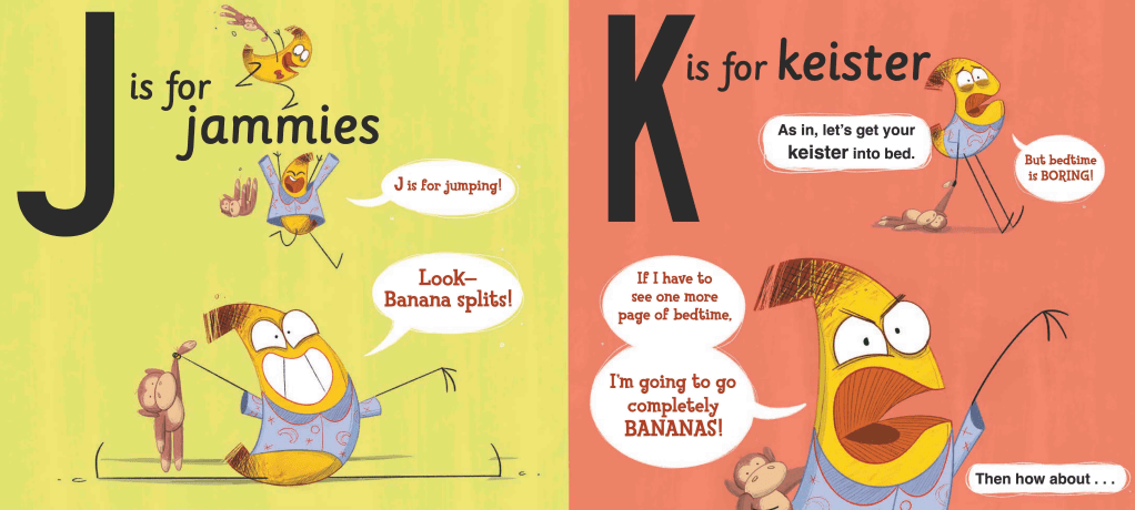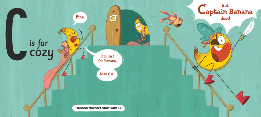 A is for Awake . . . but B is for Bedtime. When the narrator of this alphabet book tries to make it a bedtime book, Banana objects. Bedtime is BORING! And Banana is the star of this book, so it should really be called B Is for Bananas instead. It shouldn’t be about bedtime at all.