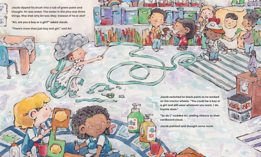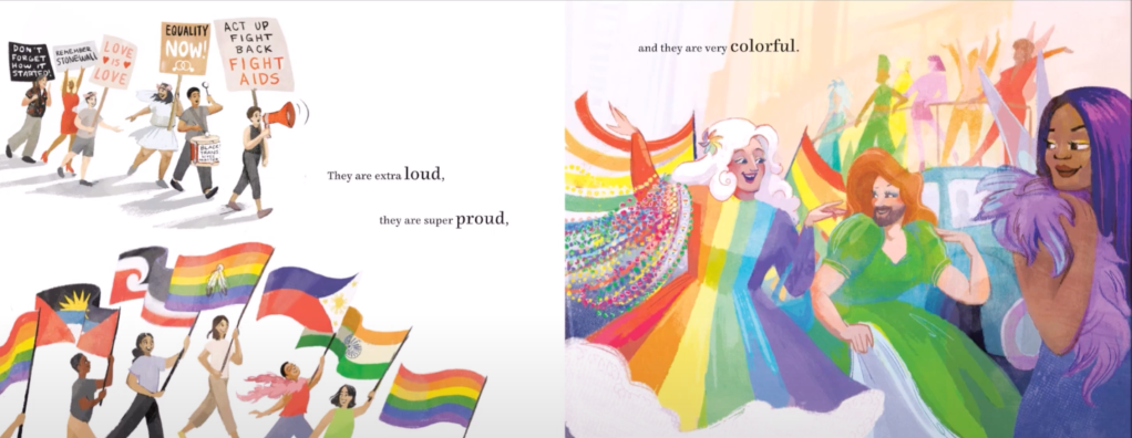The whole book is charming and colorful, and focuses on what it’s like to be at a parade and what it means to have pride. My favorite spread is when the little girl says, “…there are three things that all of the people in the parade have in common…”