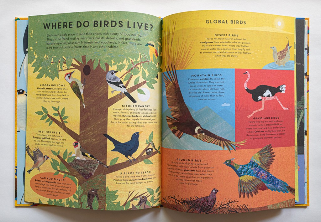 The book designer for Isabel and the Invisible World chose Alice, a serif font, for the body text, and the text and artwork flow across the pages much as in fiction picture books. There is dialog throughout the story, and the informational page at the end is distinguished from the narrative mainly by the text being justified: all lines are the same length. In Birds Everywhere, there is no narrative plot arc. Rather, the text is all information often divided by topic on separate spreads. Bright-colored backgrounds help organize the many text blocks.