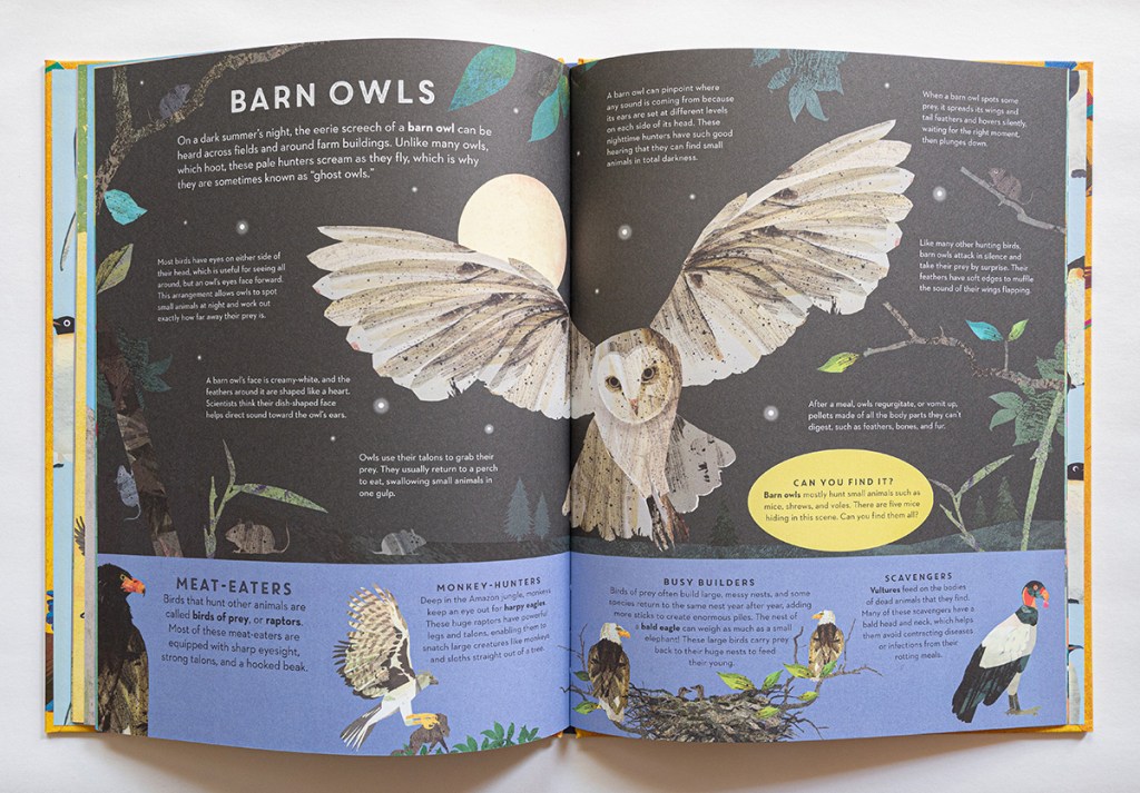 The engaging graphics use vibrant color and movement to show birds’ many strategies for feeding, nesting, and migrating thousands of miles. From the smallest hummingbird to the wandering albatrosses with the largest wingspan of any bird – ten feet – the text explains that all have feathers, a beak, two legs, and two wings and all are born from eggs.