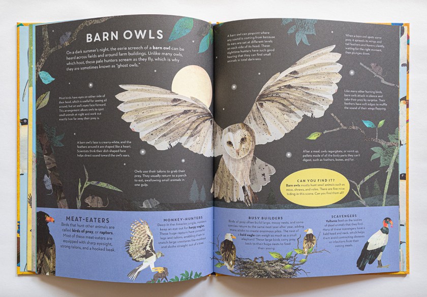 Yet birds vary in significant ways. Secretary birds eat venomous snakes, owls hunt at night on silent wings, and oxpeckers eat the parasites that live on large savannah mammals like zebras. A double-page spread about long-distance migration shows the amazing stamina of many birds. Distance heroes of the migratory world are Arctic terns that may travel as much as 1.5 million miles in their lifetime.