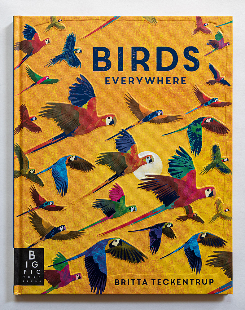 On the cover of Birds Everywhere is one person’s name – Britta Teckentrup. And on the spine of the book, significant since people see it when it is shelved in a library or bookstore, are the title, the publisher’s logo, and the same person’s name: Britta Teckentrup. What is surprising about this design element is that this is the illustrator’s name only. Most typically both the author and illustrator would be included. This book is part of a series of four nonfiction books about aspects of the natural world. The first, Fish Everywhere, was written and illustrated by Britta Teckentrup. It had the same textured and blind-embossed treatment of the cover and similar page layouts and use of color as seen in the other books in the series. So, Britta Teckentrup’s way of organizing the information, her use of strong color for backgrounds, and the texture of the cover with its blind embossing to emphasize the physicality of the fish became her signature format for the series. Camilla de la Bedoyere is the author of hundreds of non-fiction children’s books, including some that were illustrated by other artists. She wrote the text to fit the series’ goals but did not initiate the series.