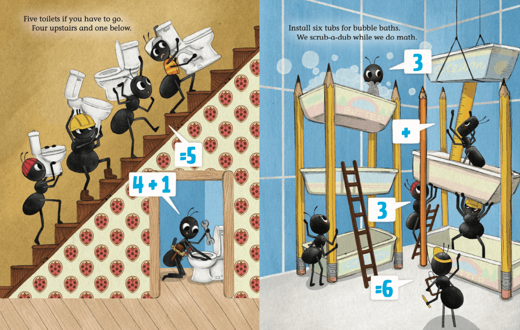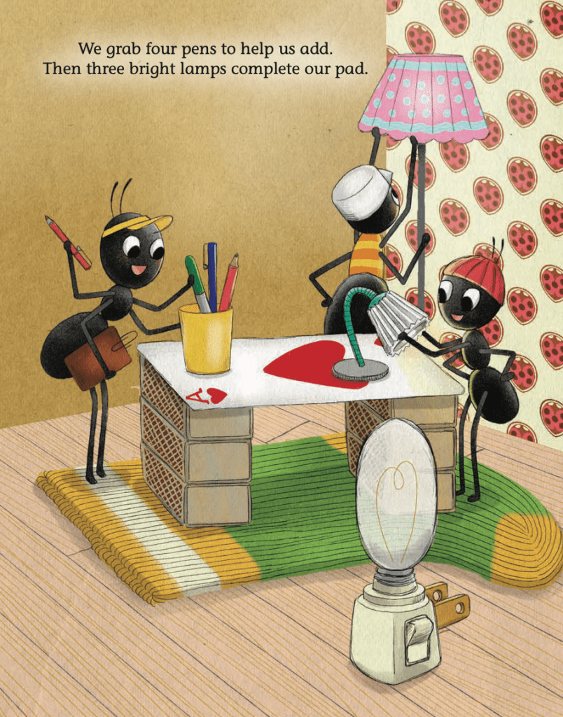 SMARTY ANTS is skillfully illustrated by Erin Taylor. Her delightful depictions of the ants add a beautiful layer by using big things to make small things. A sock is a rug, a playing card is a table, butter containers are bathtubs. This gives readers the opportunity to notice repurposed items throughout the story.