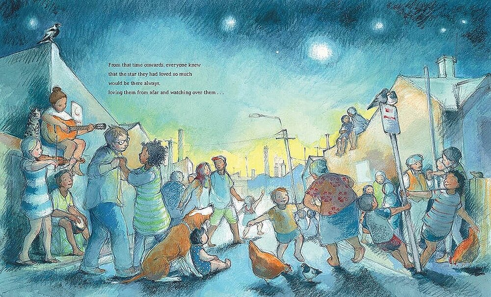 Young and old feel the loss deeply. But a child discovers the star had “merely returned to its home in the heavens” where it could watch over and love them forever more.