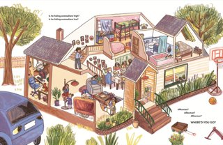 RGL: I agree about Noa’s illustrations of the house! How AMAZING is that spread that shows the entire interior layout?!? I love it so much. AND it’s probably the most difficult spread for readers to find Afikoman hiding, so I love it for that reason as well!
