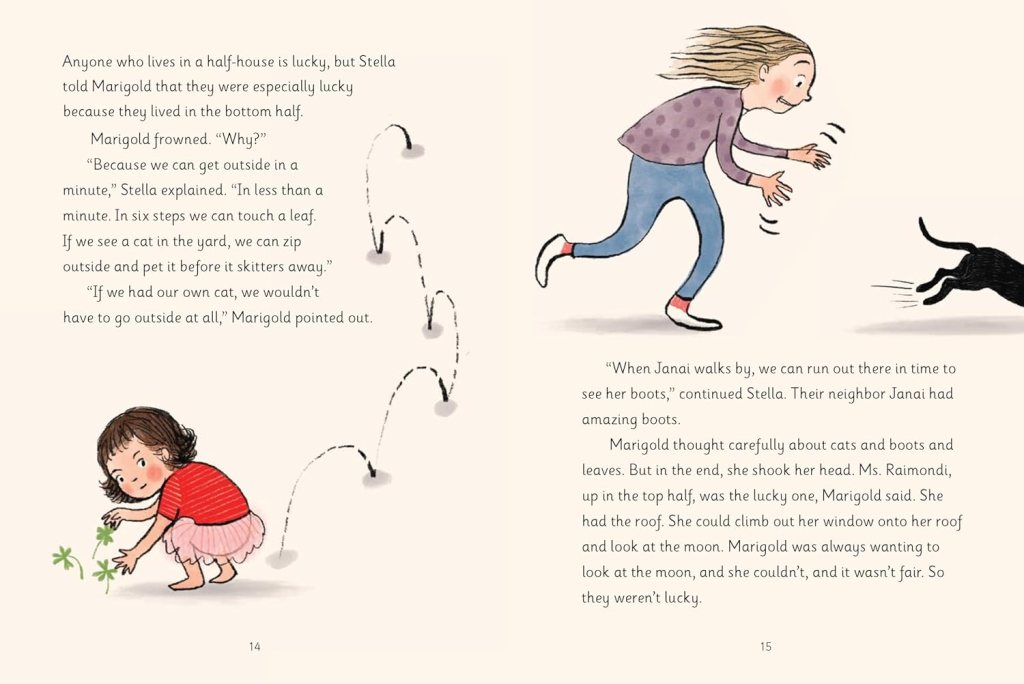 Stella and Marigold are the sharers and keepers of important secrets about the world. Kids understand the world as it really is, but adults don’t always. It’s a good thing Marigold has her older sis, Stella, to teach her what she needs to know—things adults won’t talk about. That they live in the lucky half of their duplex house: the bottom half. Lucky, because in only six steps they can touch a leaf outside. It takes Ms. Raimondi forty-two steps from the upstairs unit…they counted! And when their neighbor Janai walks by, they can run out in time to see her amazing boots (Janai has amazing boots).