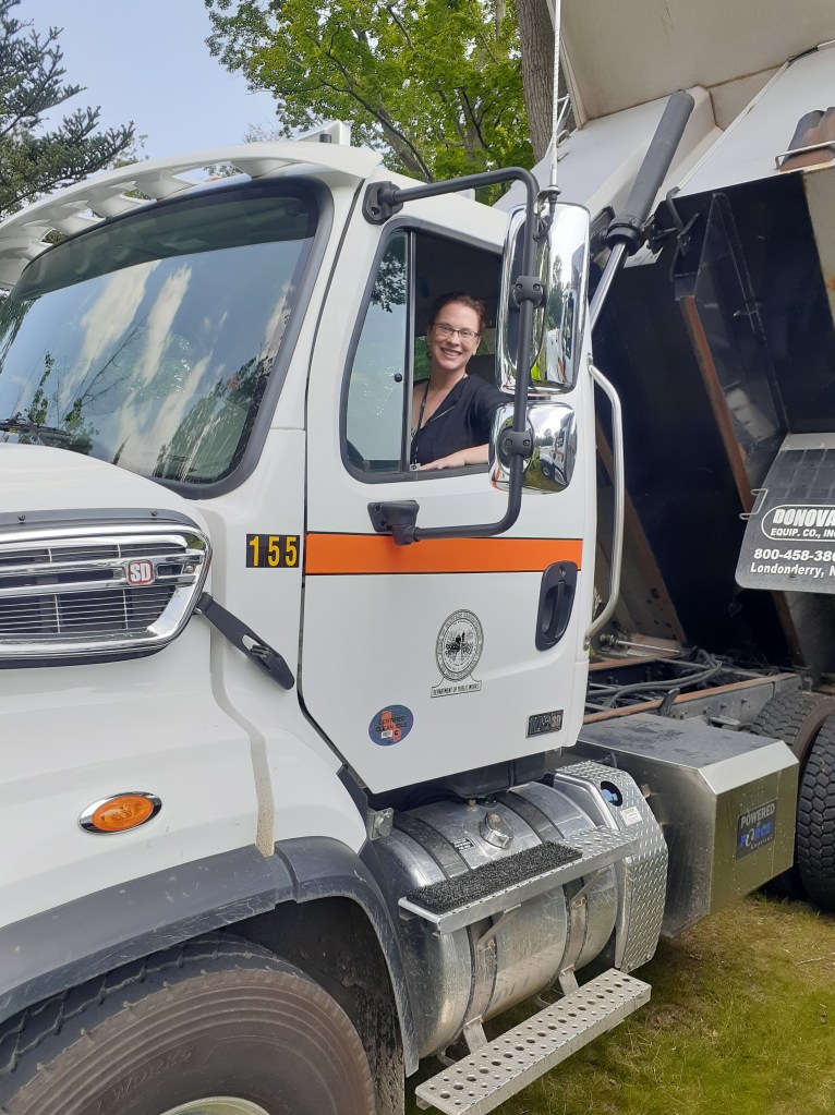 [Photo of Librarian (me) in a DPW truck. Photo credit: Amy]